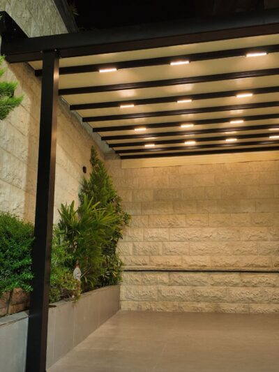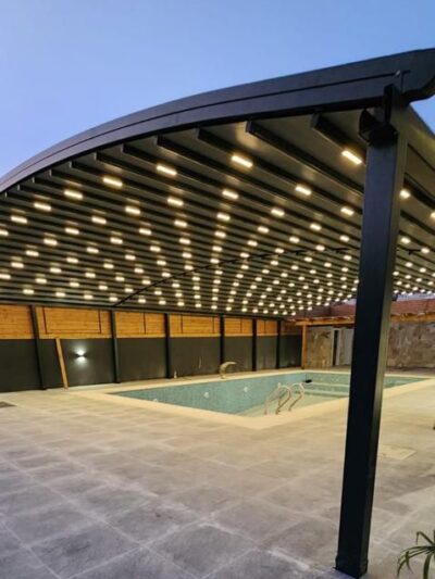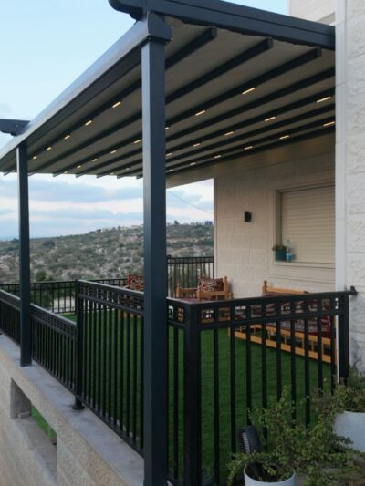 פרגולה אלומיניום בצבע שחור עם בד בריזנט ותאורת לד
