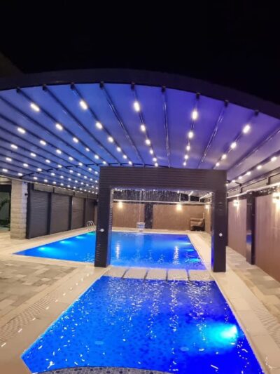 פרגולה עם בסיס אלומיניום בצבע שחור עם בריזנט בצבע לבן ותאורת לד