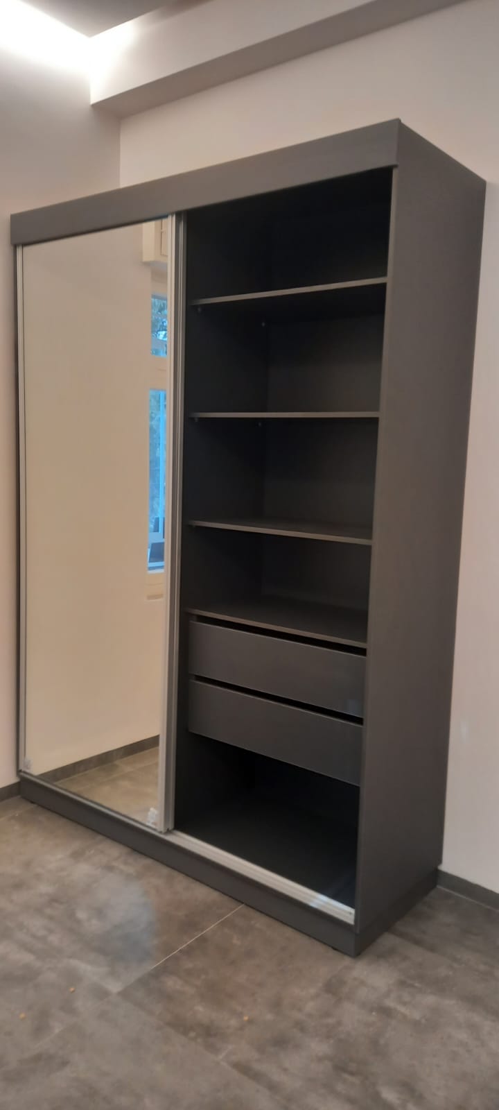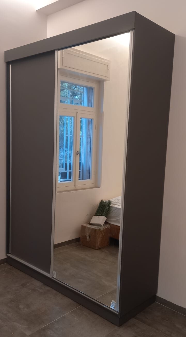 ארון הזזה 2 דלתות בציפוי פורמייקה בצבע אפור עם מראה