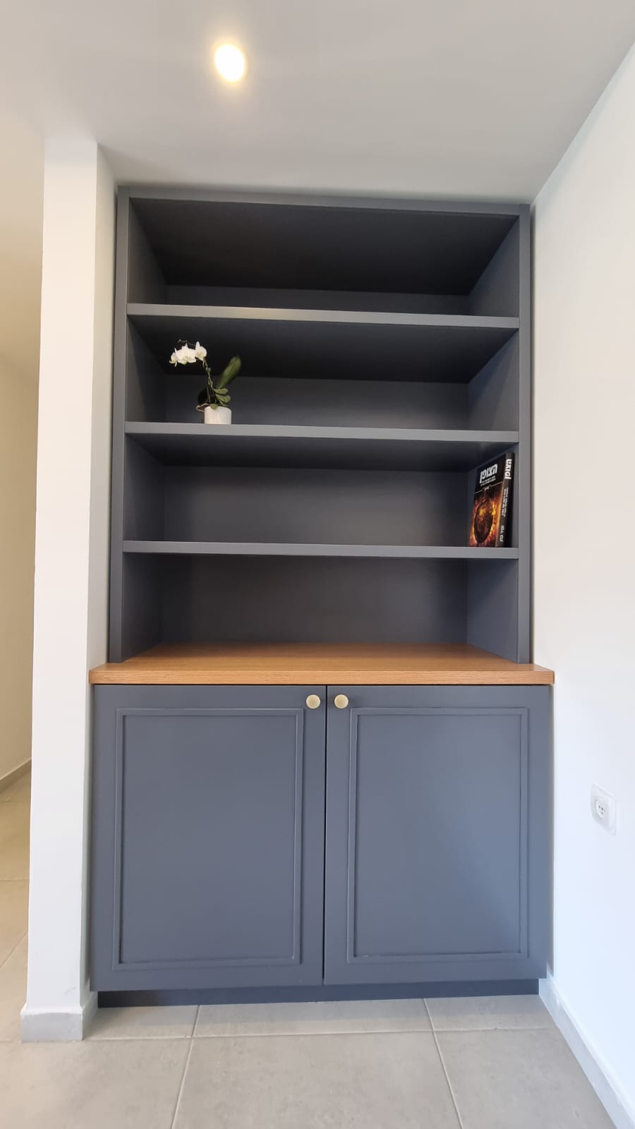 ארון פינתי עם מדפים בציפוי פורמייקה ומדף מעץ טבעי