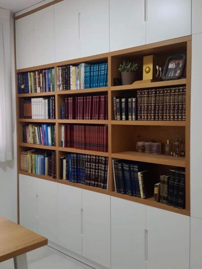 ספרית קודש בשילוב עץ טבעי ופורמייקה שמנת וידיות אינטגרליות