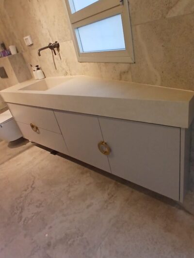 ארון חדר מקלחת בצבע סהרה עם ידיות מעוגלות בצבע זהב