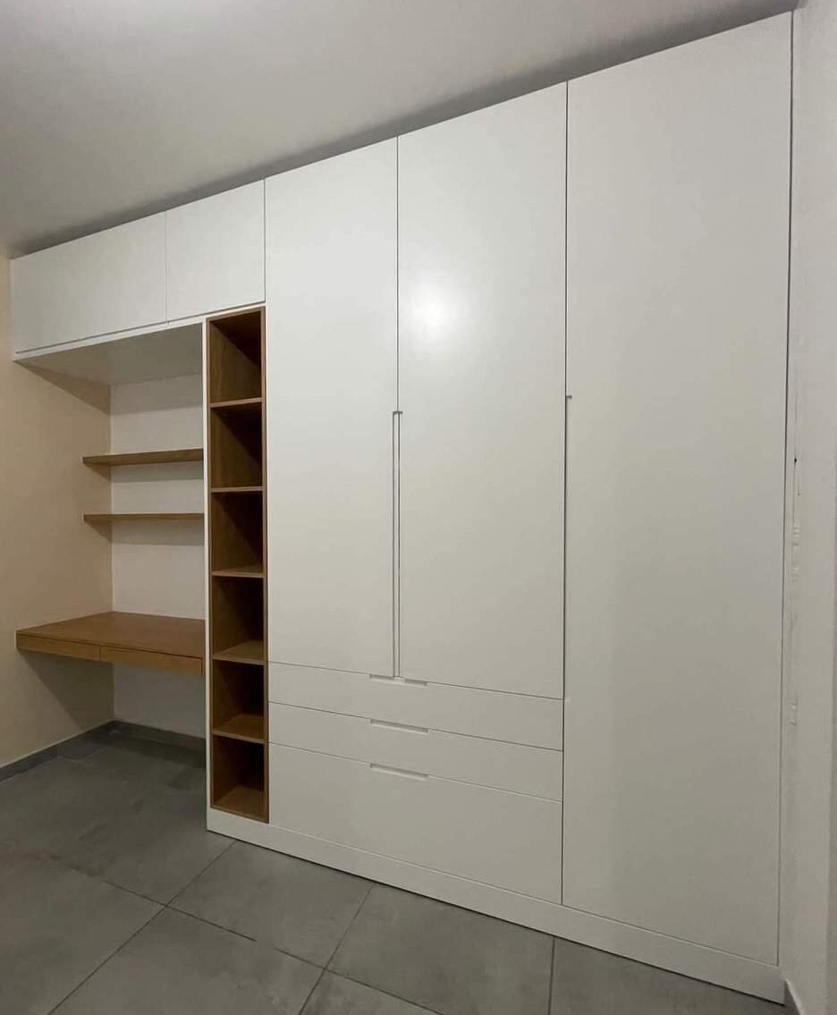 ארון 3 דלתות ומגירות בציפוי פורמייקה עם שולחן ונישה של מדפים בהתאמה אישית