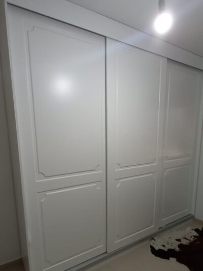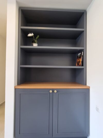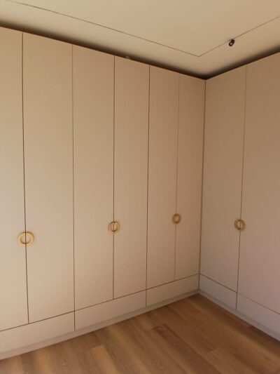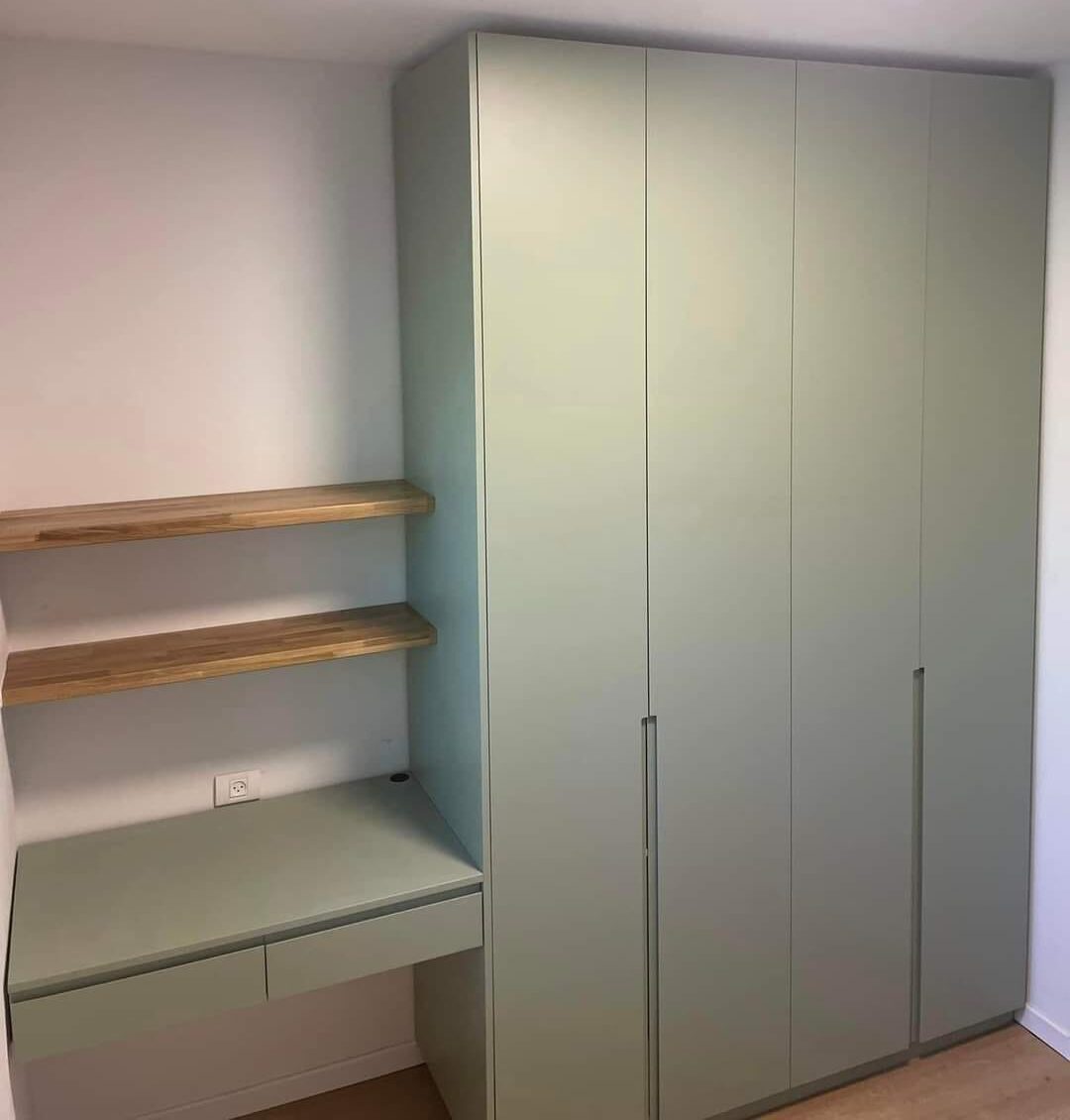 ארון 4 דלתות בציפוי פורמייקה עם ידיות אינטגרליות עם תוספת שולחן תואם ומגירות ו-2 מדפים בצבע עץ טבעי