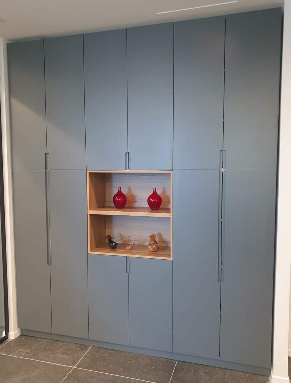 ארון 6 דלתות בציפוי פורמייקה בצבע אפור עם ידיות אינטגרליות ונישה בצבע עץ טבעי
