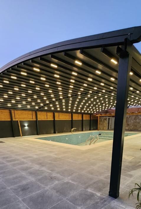 פרגולה אלומיניום בצבע שחור עם בד בריזנט ותאורת לד